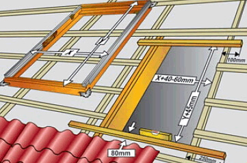 Окна устанавливаются на обрешётку и фиксируются в стропильные балки. Если устанавливаются окна большого размера, следует внимательно отнестись к стропильной конструкции и при необходимости подогнать её под размер оконного проёма, используя контррейки для фиксации.