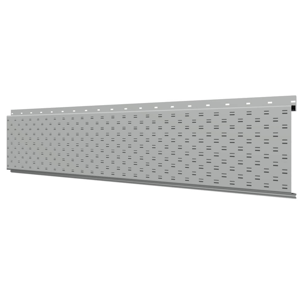 Линеарная потолочно-стеновая панель с ПЕРФОРАЦИЕЙ для вентиляции цвет RAL9006 Серебро применяется в качестве софитов для подшивы крыши, наружной и внутренней отделки потолков, стен, фронтонов фасада дома в Иваново.