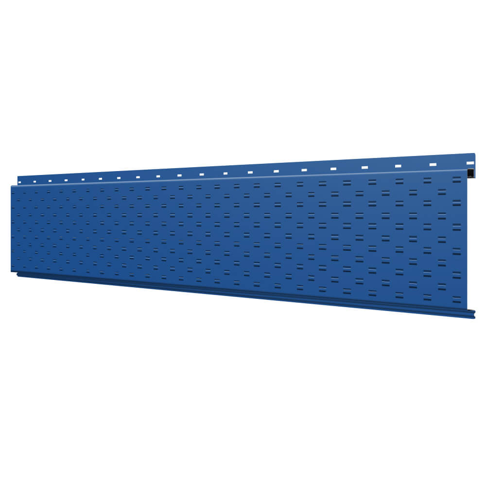 Линеарная потолочно-стеновая панель с ПЕРФОРАЦИЕЙ для вентиляции цвет RAL5005 Синий Сигнал применяется в качестве софитов для подшивы крыши, наружной и внутренней отделки потолков, стен, фронтонов фасада дома в Иваново.