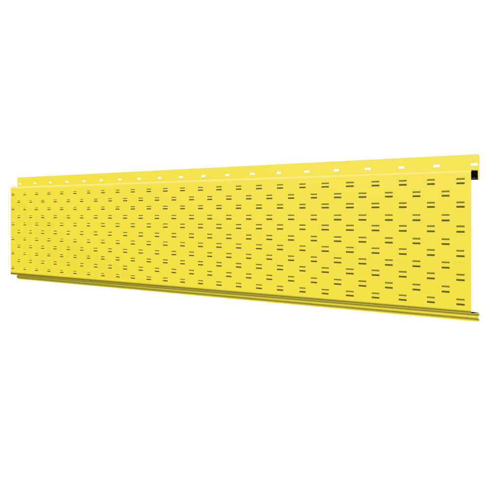 Линеарная потолочно-стеновая панель с ПЕРФОРАЦИЕЙ для вентиляции цвет RAL1018 Желтый применяется в качестве софитов для подшивы крыши, наружной и внутренней отделки потолков, стен, фронтонов фасада дома в Иваново.