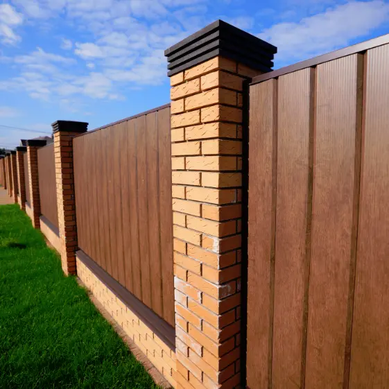 Гармоничное сочетание прочности и современного стиля: на кирпичных столбах забора установлены полимерпесчаные колпаки из коллекции Bona Хай-Тек в элегантном коричневом цвете. Их лаконичный дизайн отлично вписывается в архитектуру участка и подчеркивает выразительность забора из металлического сайдинга Евро-Брус под дерево в оттенке Тёмный Каштан с текстурным 3D покрытием Принтек в вертикальном заполнении. Такое решение не только усиливает декоративный эффект, но и обеспечивает надежную защиту столбов от воздействия осадков и перепадов температур.